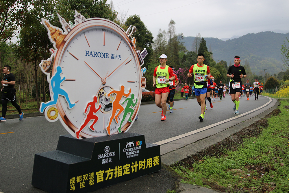 2018年3月18日,一年一度的成都雙遺馬拉松在都江堰隆重舉行。來自世界29個國家34個省市的3萬多名參賽選手齊聚馬拉松賽道起點。雷諾表作為賽事官方指定計時用表,為比賽事精準計時。在起跑倒計時5分鐘、3分鐘、1分鐘后鳴槍開跑,選手們激烈追逐、奔騰如流,場面十分激烈。
